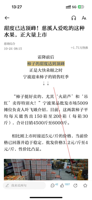 3、在文章詳情頁面閱讀文章內容,了解文章介紹的信息,包括商品特點價格走勢等內容,點擊下方的分享按鈕。