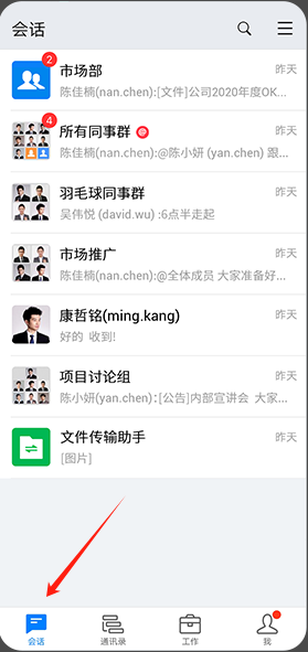 1、點擊會話頁面,展示市場部等多個工作群組消息,有文件傳輸、活動通知等,溝通便捷。