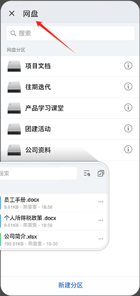 2、點擊網盤頁面,設有項目文檔等分區,可搜索文件,方便員工存儲和查找公司資料。