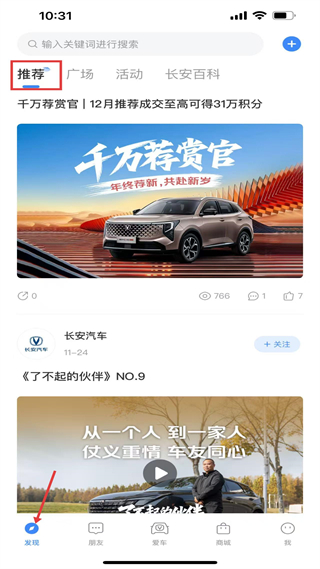 2、登錄后進入發現頁面,頂部有搜索欄,設推薦、廣場等標簽,推薦欄展示千萬薦賞官活動,還有長安汽車發布的內容,底部設發現、朋友等導航欄。