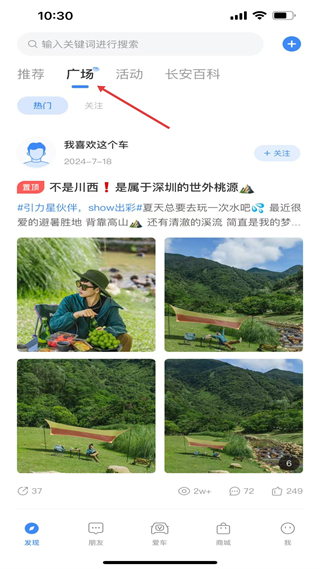 4、切換到廣場標簽頁,分熱門、關注分類,展示用戶分享的帶話題帖子,附多張圖片,顯示瀏覽、評論等互動數據,可參與評論、點贊操作。
