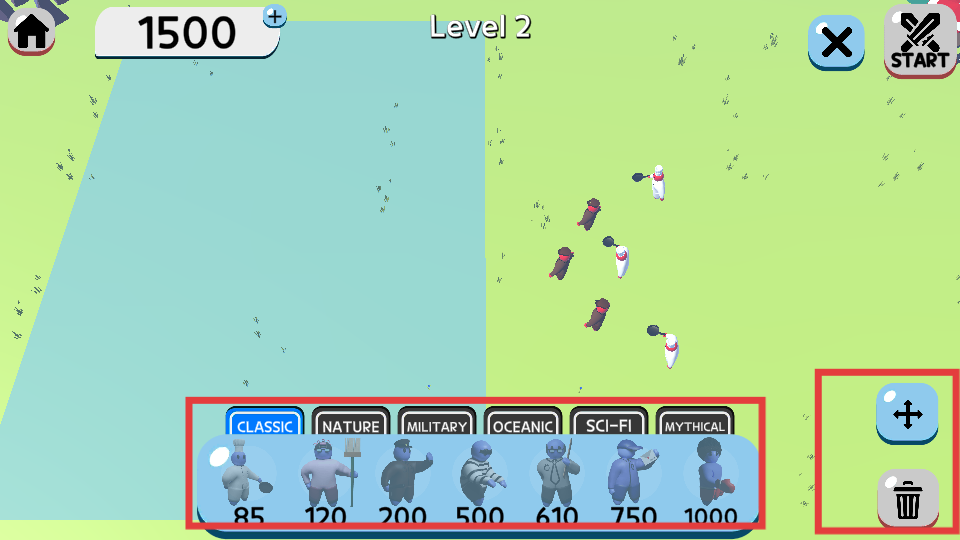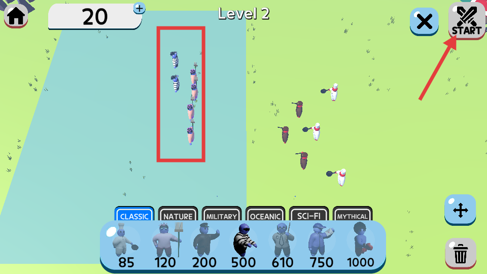 2、布置好兵種后點擊右上角START按鈕啟動戰斗,此時能看到布置的兵種開始行動,進入與敵方的對抗階段,要確保兵種布置合理,讓他們在戰斗中發揮最大作用。