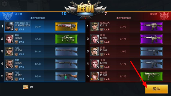 4、戰斗勝利后查看雙方戰績,點擊確認按鈕,領取獎勵,提升角色等級和槍械戰力,備戰后續對決。