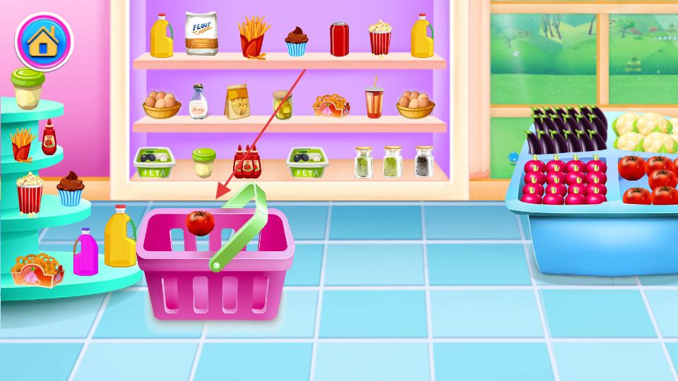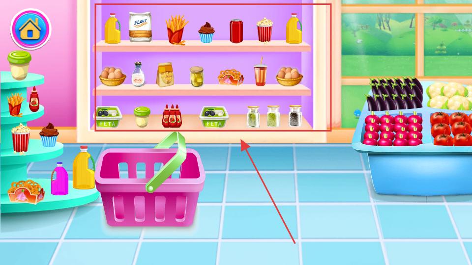 3、進入食材選購場景,查看貨架上的各類食材,根據制作披薩的需求,挑選合適的食材,為制作披薩準備材料。