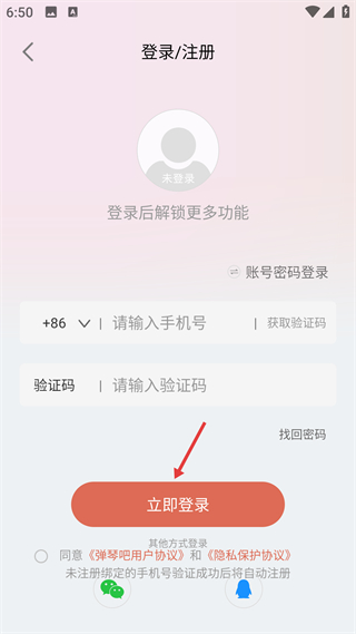 1、進入彈琴吧登錄頁,選手機號+驗證碼或第三方方式登錄,同意協議后未注冊手機號自動注冊,登錄后解鎖更多功能。