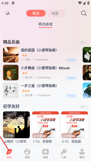 2、進入發現頁,瀏覽精選曲譜,含精品名曲、初學友好類內容,點擊打開曲譜查看對應樂譜,助力樂器練習。