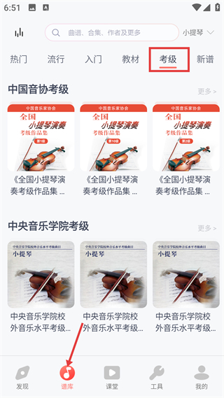 3、進入譜庫考級版塊,查看中國音協、央音的小提琴考級曲譜,按級別分類,便于匹配對應考級階段的練習內容。
