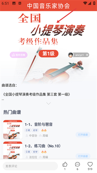 4、進入考級曲譜詳情頁,查看對應級別熱門曲譜,點擊打開曲譜看具體樂譜,參與互動,輔助考級曲目練習。