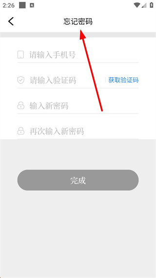 4、若忘記密碼,進入對應頁面輸入手機號、獲取并填寫驗證碼,設置新密碼并再次確認,完成后點擊完成即可重置密碼。