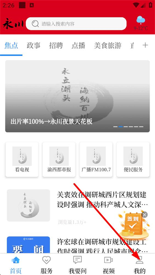 1、進入應用首頁可瀏覽焦點資訊,包含城市規劃、民生動態等內容,還有看電視、便民服務等功能入口,底部設首頁、服務等板塊入口。