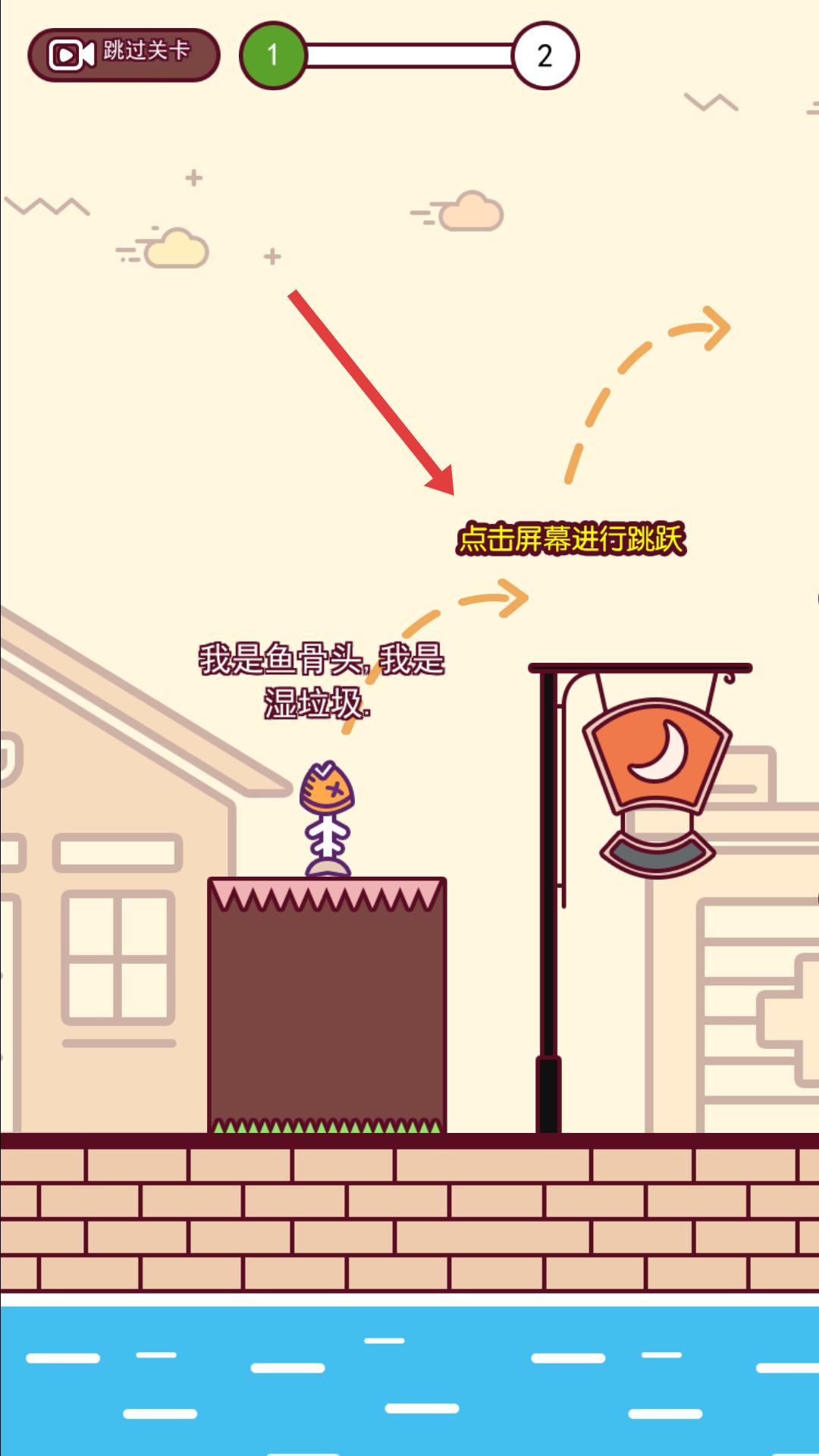 2、當魚骨頭等垃圾出現在平臺上,點擊屏幕讓垃圾跳躍,朝著正確的垃圾桶方向移動,為后續分類做準備。
