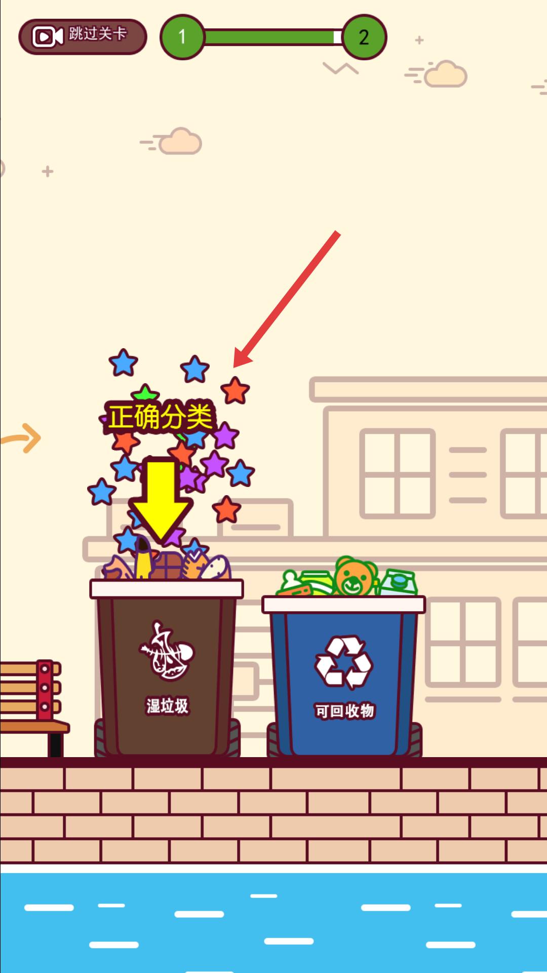 3、要將垃圾準確分類,像魚骨頭這類濕垃圾,需讓其跳進濕垃圾桶,成功分類會有彩色星星獎勵,證明操作正確。