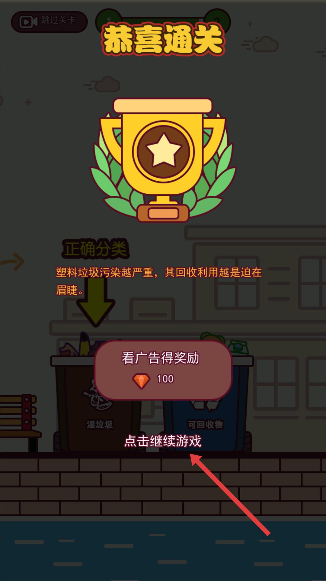 4、通關后會顯示恭喜通關,還可選擇看廣告獲得100鉆石獎勵,之后點擊繼續游戲,就能進入下一關繼續挑戰。