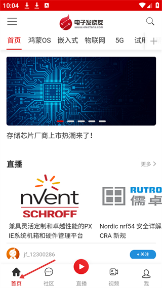 1、 首頁涵蓋鴻蒙OS、嵌入式等板塊,呈現存儲芯片廠商上市熱潮資訊,設直播板塊,底部有首頁、社區等功能導航。