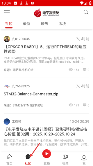 2、社區板塊,分最新、最熱、版塊類別,展示RT-THREAD適配、STM32平衡車等電子技術帖,是電子愛好者技術交流陣地。