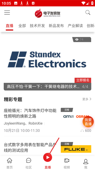 3、直播板塊,有技術開發、新品發布等分類,呈現干簧繼電器技術直播,還有汽車飾件燈照明等精彩專題,支持直播報名與回看。