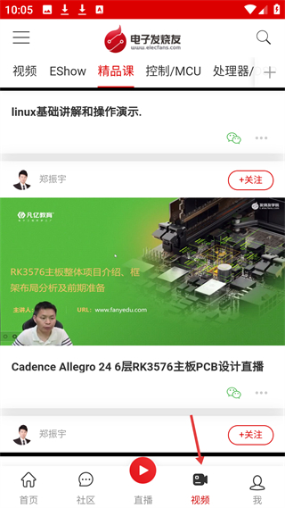 4、視頻板塊,含精品課、控制MCU等分類,展示Linux基礎、RK3576主板PCB設計等電子技術視頻課程,助力電子愛好者提升專業技能。