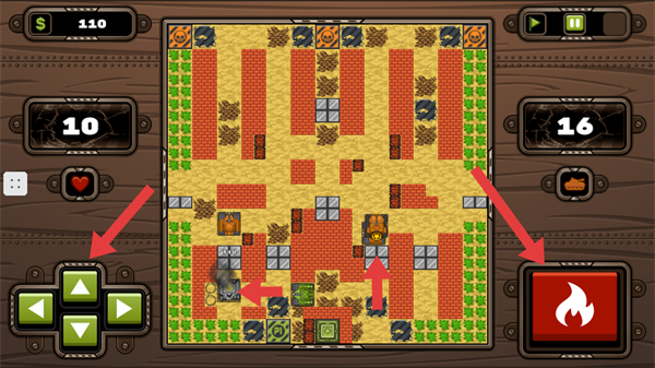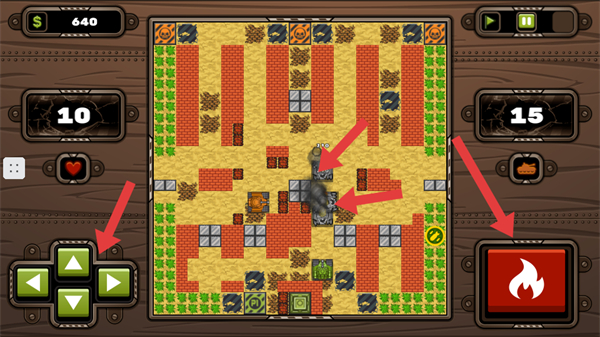 3、用方向鍵操控坦克移動,點擊火焰按鈕發射炮彈,攻擊敵人或破壞障礙物,推進游戲進程。