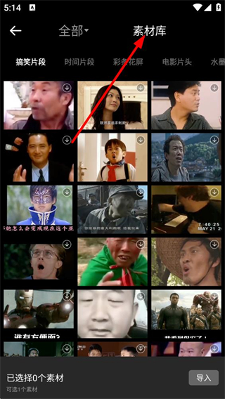 3、進入素材庫頁面,包含搞笑片段等不同分類的素材,選擇所需素材后點擊導入,即可將其添加至當前的視頻編輯項目中。