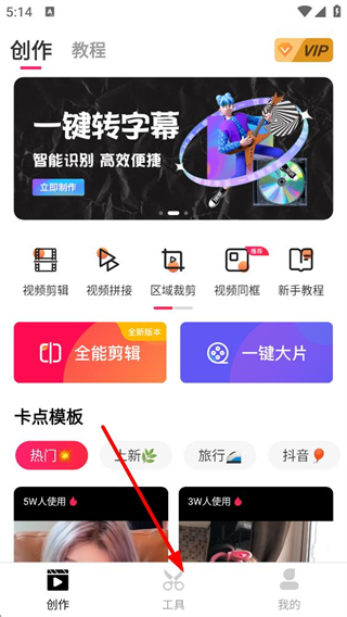 1、進入愛剪輯創作頁面,可見一鍵轉字幕的推廣內容,還有視頻剪輯等功能選項及全能剪輯工具,同時提供不同分類的卡點模板助力創作。