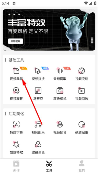 2、進入工具頁面,可使用視頻裁剪等基礎工具,也能借助特效字幕等后期美化功能,這些工具可滿足多樣的視頻編輯需求。