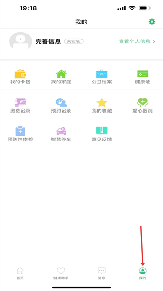 4、個人中心可完善信息,管理卡包家庭等,查看繳費預約記錄,還有預防性體檢等功能,方便管理健康相關事務。
