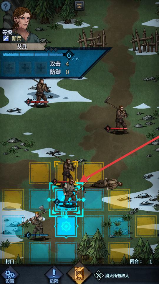 4、戰斗中操控角色如艾丹攻擊4、防御0,在方格地圖移動、攻擊,回合制推進,消滅敵人,結合攻防數值與地形,制定策略取勝。