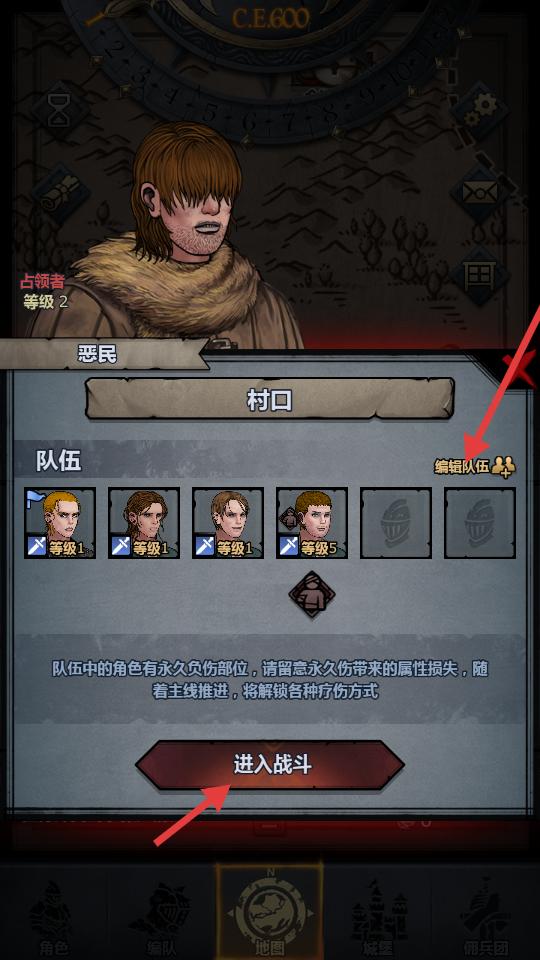 2、查看村口隊伍角色存在永久負傷主線推進解鎖治療,編輯編隊,搭配等級1到5角色,點擊進入戰斗,迎戰占領村口的惡民。