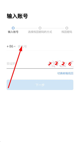 2、若需找回密碼,進入輸入賬號環節,選擇手機號找回方式,填寫對應手機號及驗證碼,完成驗證后即可進入后續密碼找回流程。