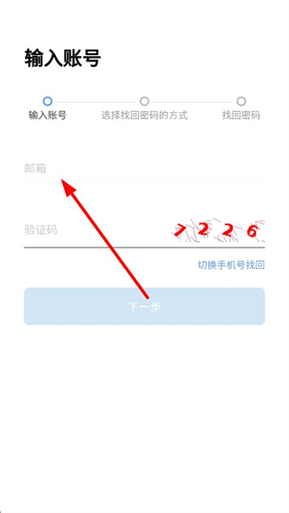 3、也可切換為郵箱找回密碼,對應輸入框填寫郵箱地址及驗證碼,驗證通過后即可繼續操作,適配不同賬號綁定的信息類型。
