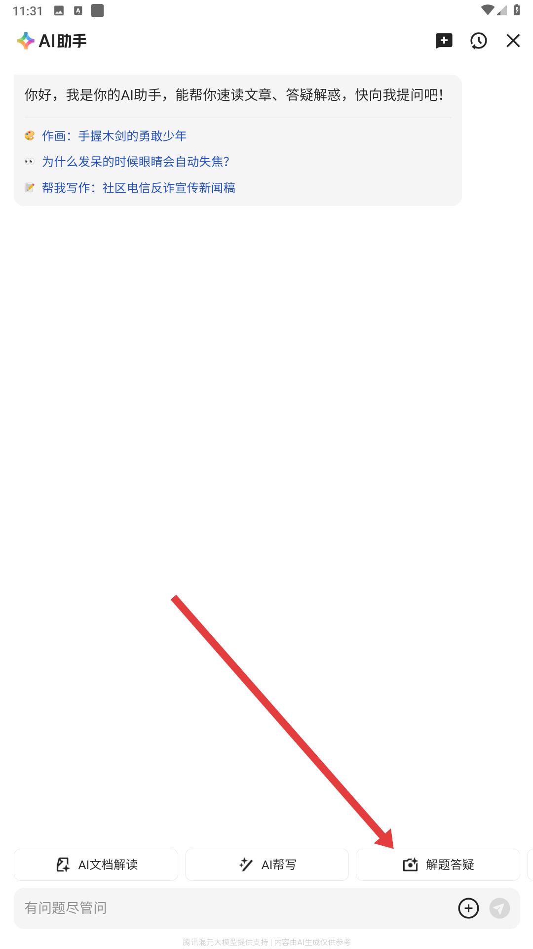3、AI助手界面,有AI文檔解讀、AI幫寫、解題答疑等功能選項,點擊解題答疑,進入拍題答疑界面。