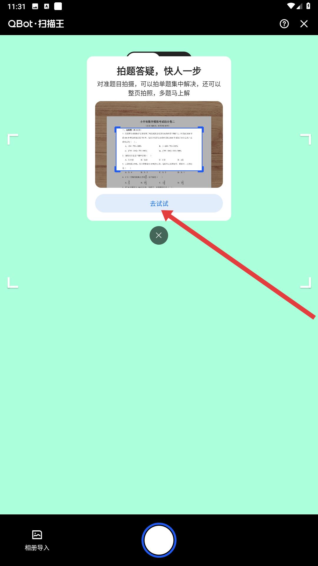 4、拍題答疑界面,可點擊去試試,對準題目拍攝,能拍單題集中解決,也可整頁拍照,實現多題馬上解的效果。