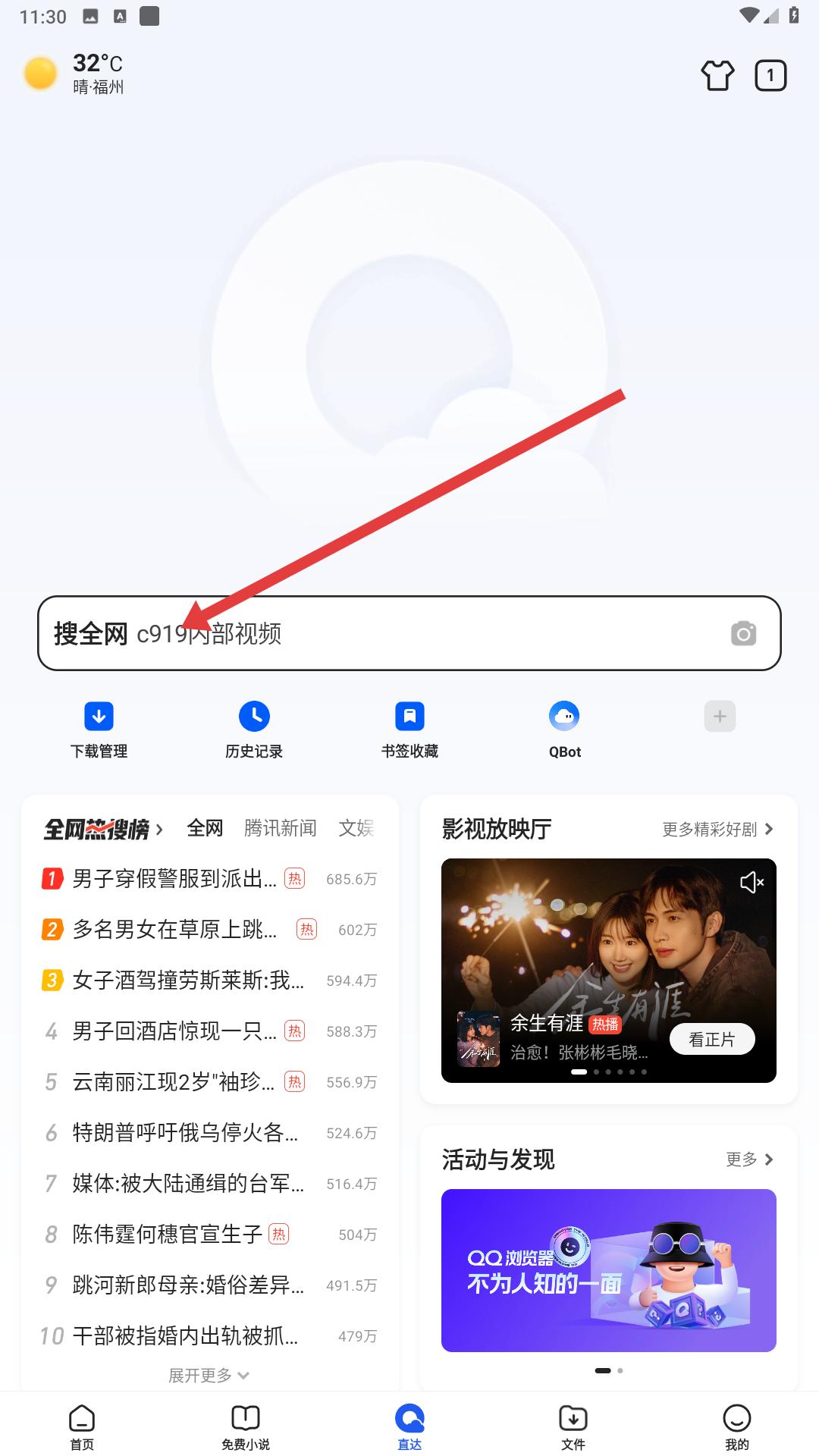 2、在直達頁面,有搜索欄、全網熱搜榜等內容,點擊搜索欄下方的QBot,進入AI助手界面。