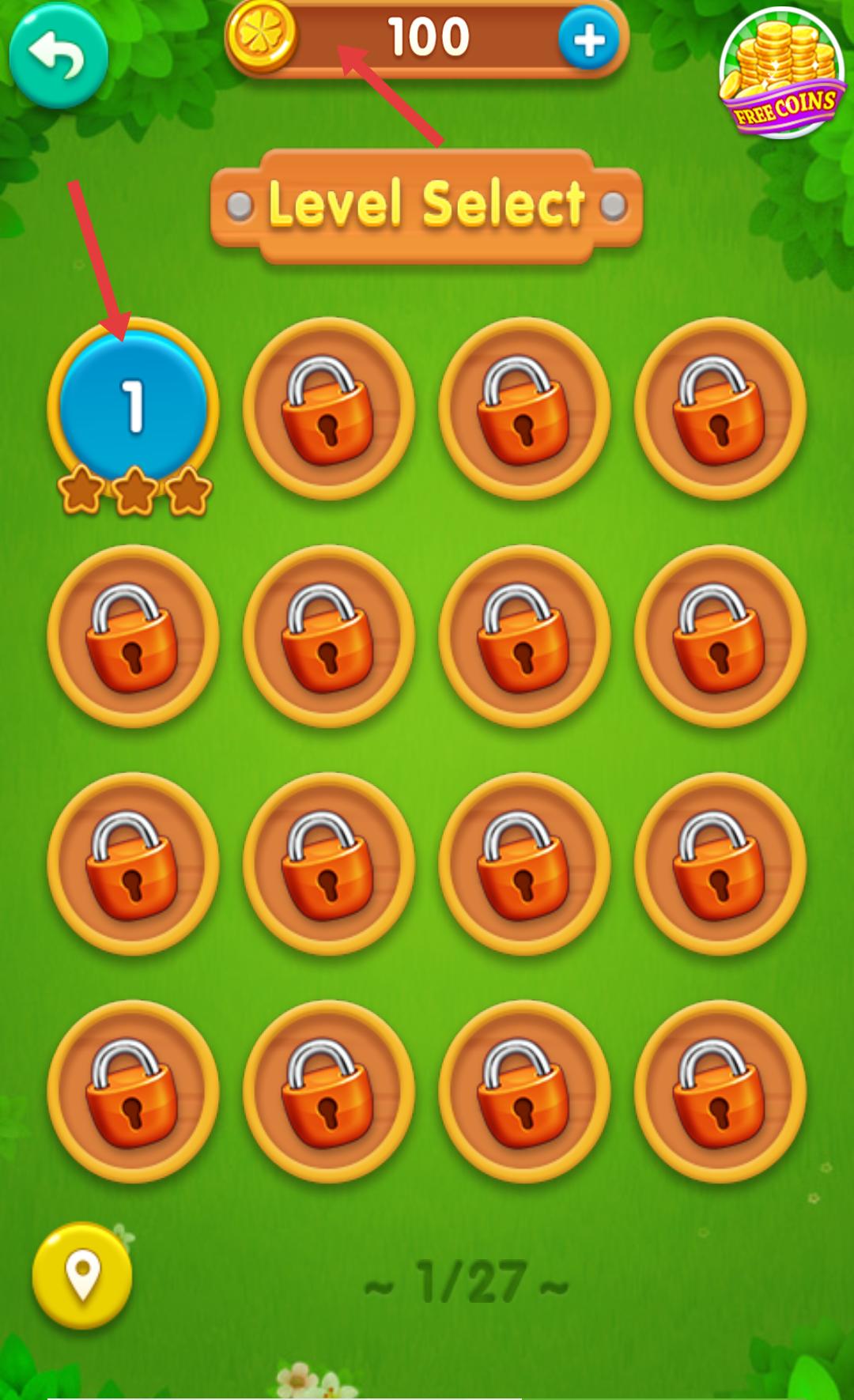 2、進入關卡選擇頁面,能看到多個關卡,只有第一關解鎖,點擊標有1的藍色圓形按鈕,可進入第一關游戲。