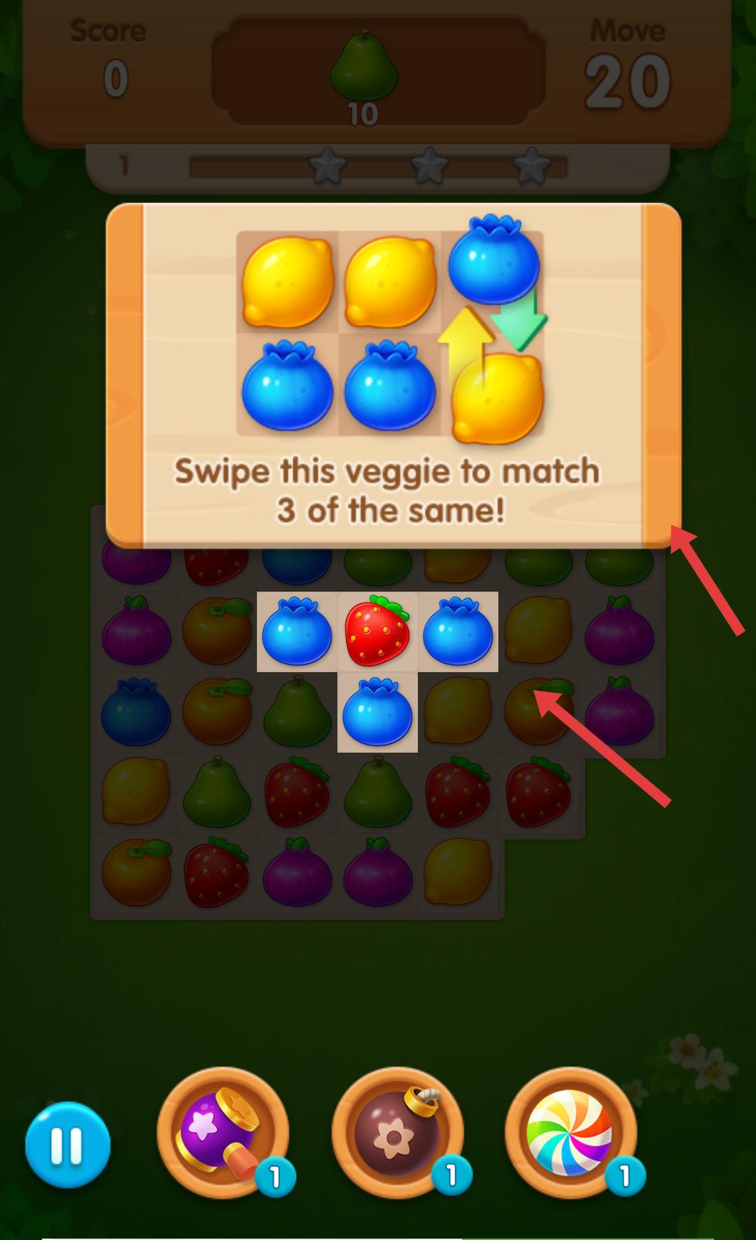 3、通過滑動水果,讓三個相同水果連成一線來消除,按照提示滑動水果完成消除任務,推進游戲進程。