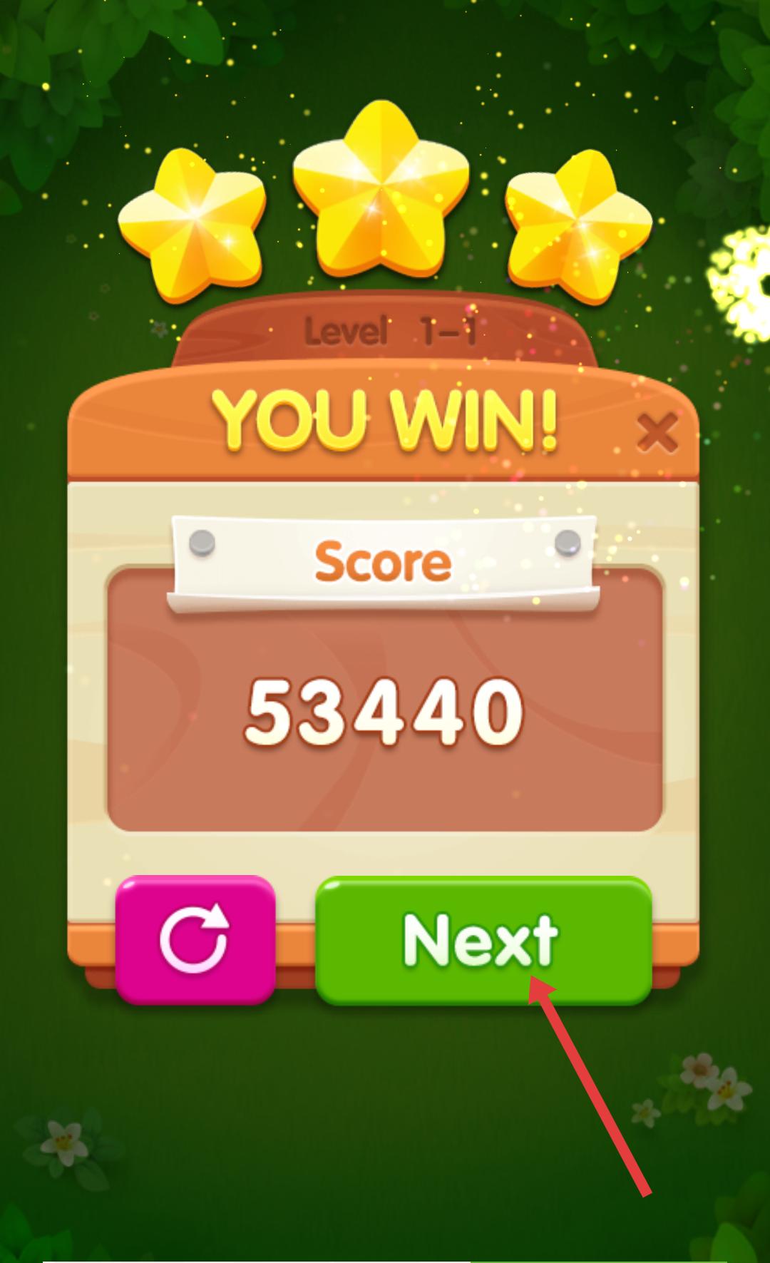 4、成功通關后會顯示勝利,還有得分和星級評價,點擊綠色Next按鈕,可進入下一關繼續挑戰。