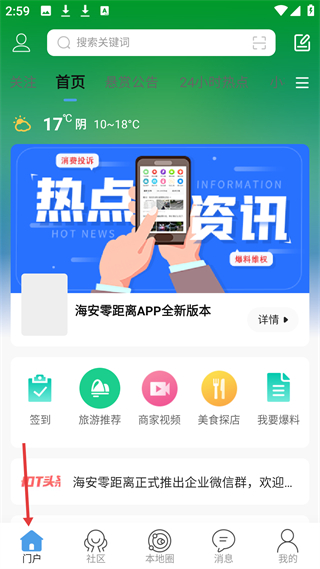 1、門戶有搜索欄,展示天氣及熱點資訊,有簽到、旅游推薦等入口,還有APP新版本介紹,提供本地資訊及服務。
