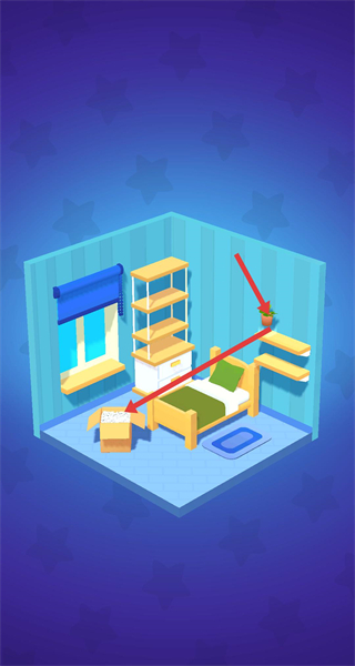2、玩家點擊取出紙箱內物品,將綠植移至墻面置物架,通過合理放置物件逐步規劃房間的空間布局。