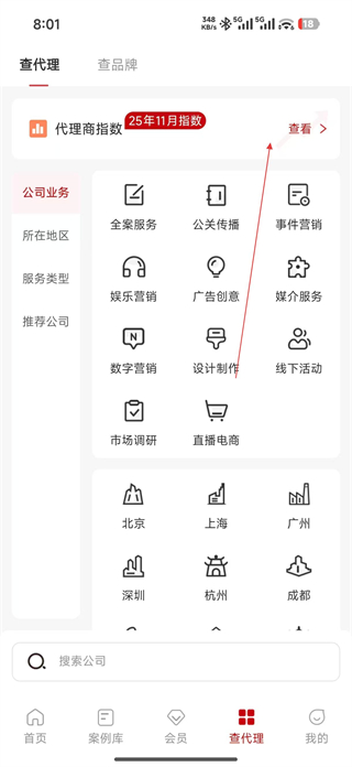 2、在詳情頁點擊查看按鈕進入查代理板塊,瀏覽公司業務服務類型等分類選項,了解平臺功能。