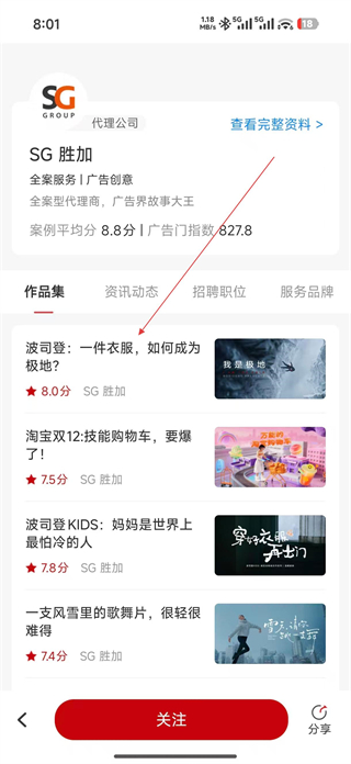 3、在查代理板塊選擇對應分類后,進入SG勝加的作品展示頁,選擇波司登相關案例,點擊進入案例詳情頁。