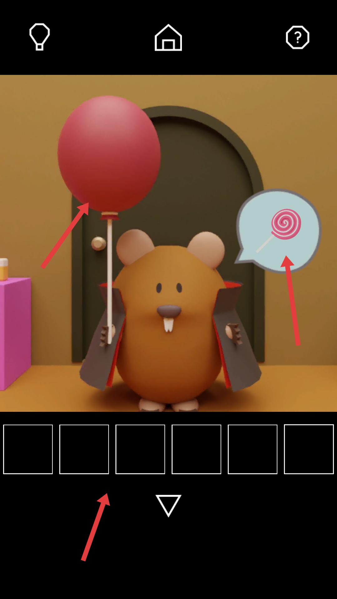 2、場景里有拿氣球的小動物,還有棒棒糖提示,下方有物品欄,可點擊氣球、棒棒糖相關區域或在物品欄操作,探索互動來推進游戲。