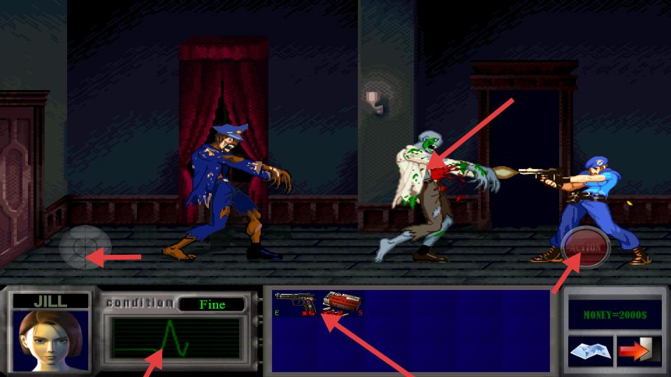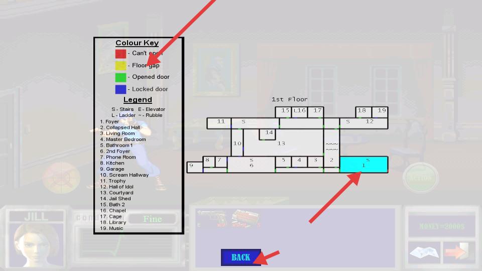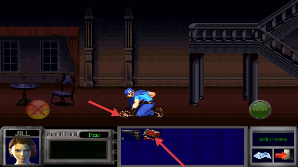 1、點擊NEW GAME開啟操控Jill在mansion探索,拾取場景物品存入背包,初始攜帶手槍與霰彈槍,MONEY為2000S,留意下方狀態條。