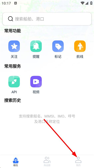 1、進入應用首頁,可使用搜索欄查找船舶或港口信息,還能使用關注提醒等常用功能,底部有船位運圈我的等入口,點擊我的進入個人中心。
