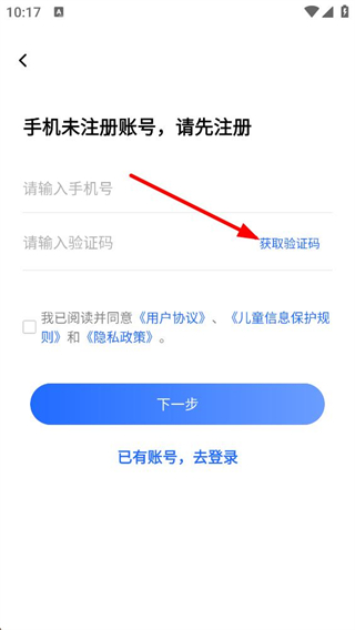 4、進入注冊界面后,輸入未注冊的手機號,點擊獲取驗證碼填寫,勾選相關協議后點擊下一步,即可完成新用戶的注冊流程。