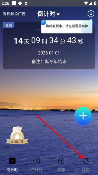 1、進入工具主界面,展示著倒計時,備注為離今年結束,底部有倒計時、正計時等功能入口,點擊我的可進入個人相關界面。