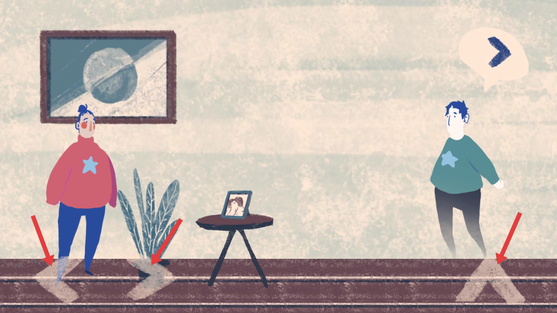 2、場景中有人物和箭頭指示,可根據箭頭方向,操控角色移動,與場景中的元素互動,推進游戲劇情發展。
