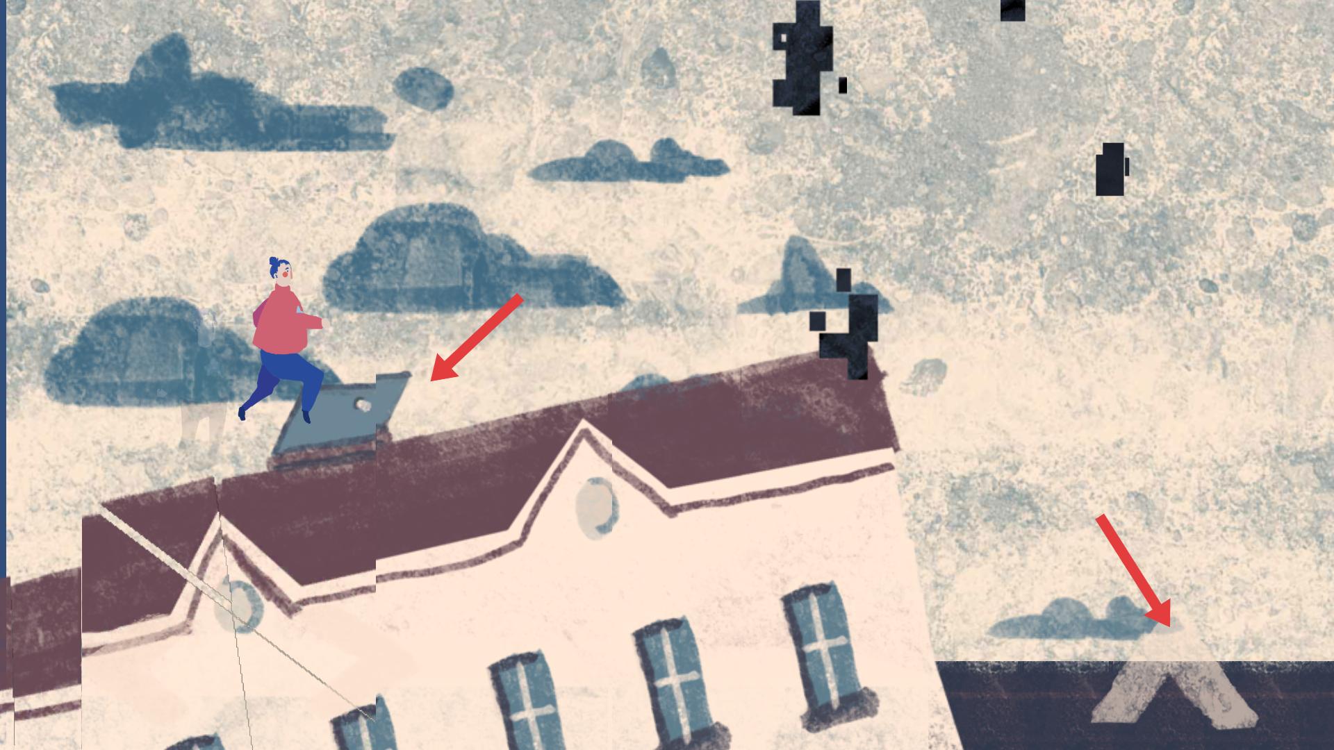 3、角色處于屋頂場景,有不同的路徑方向,需選擇合適的方向移動,避開空中的黑色方塊等障礙,繼續前進。