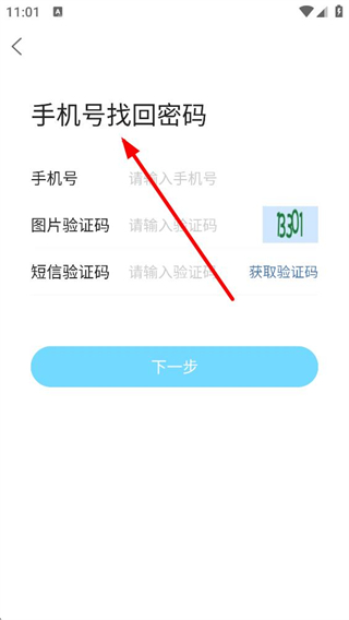 4、進入手機號找回密碼界面,輸入手機號、圖片驗證碼和短信驗證碼后點擊下一步,可完成密碼找回操作,找回賬號密碼。