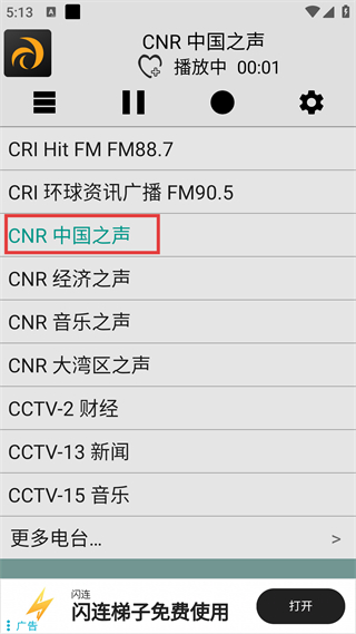 4、播放界面頁,顯示當前播放的CNR中國之聲,提供控制按鈕,同時列其他頻道,支持切換收聽觀看。