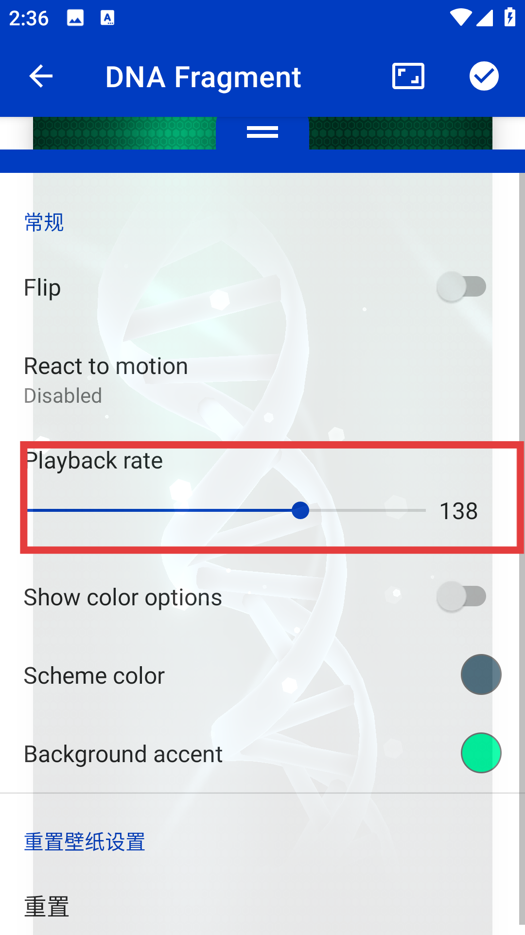 3、在彈出的設置菜單找到Playback rate選項,通過拖動進度條上的圓點,即可調整壁紙的播放速率,根據自己的喜好將其調整到合適的數值。